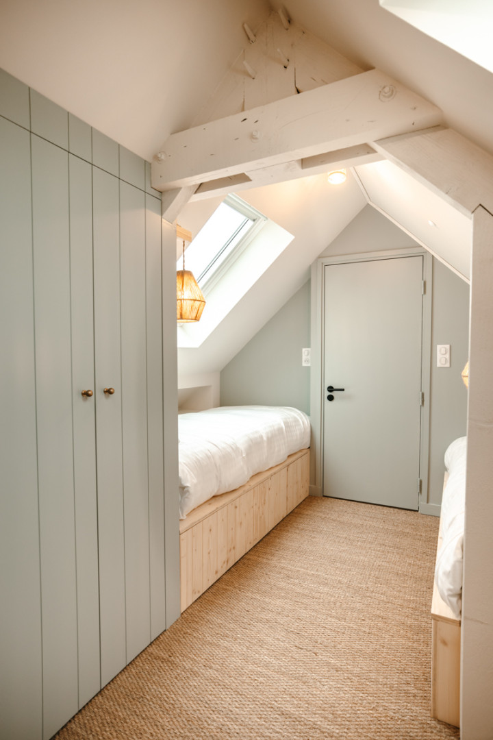 Vous montez dans le repère des jeunes ; un dortoir pour 3 niché sous les toits et une salle d’eau attenante. Il a été pensé comme un bateau, les lits cabines permettent d’avoir des espaces séparés.